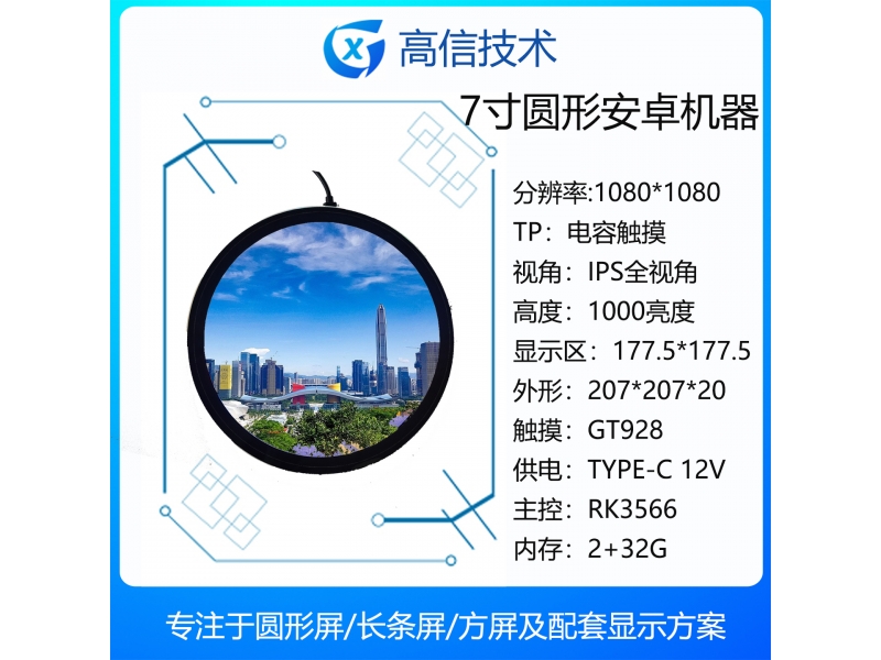• 7寸圆屏显示屏安卓整机,RK3566主控,2+32内存,自带信发