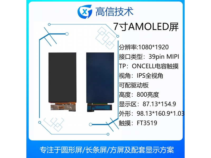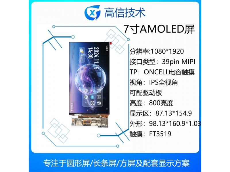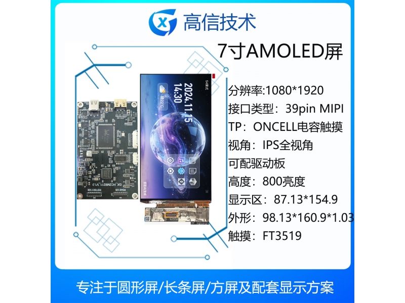• 7寸AMOLED显示屏,分辨率1080*1920,亮度达到800 nit,可配驱动板,同时实现横屏显示屏